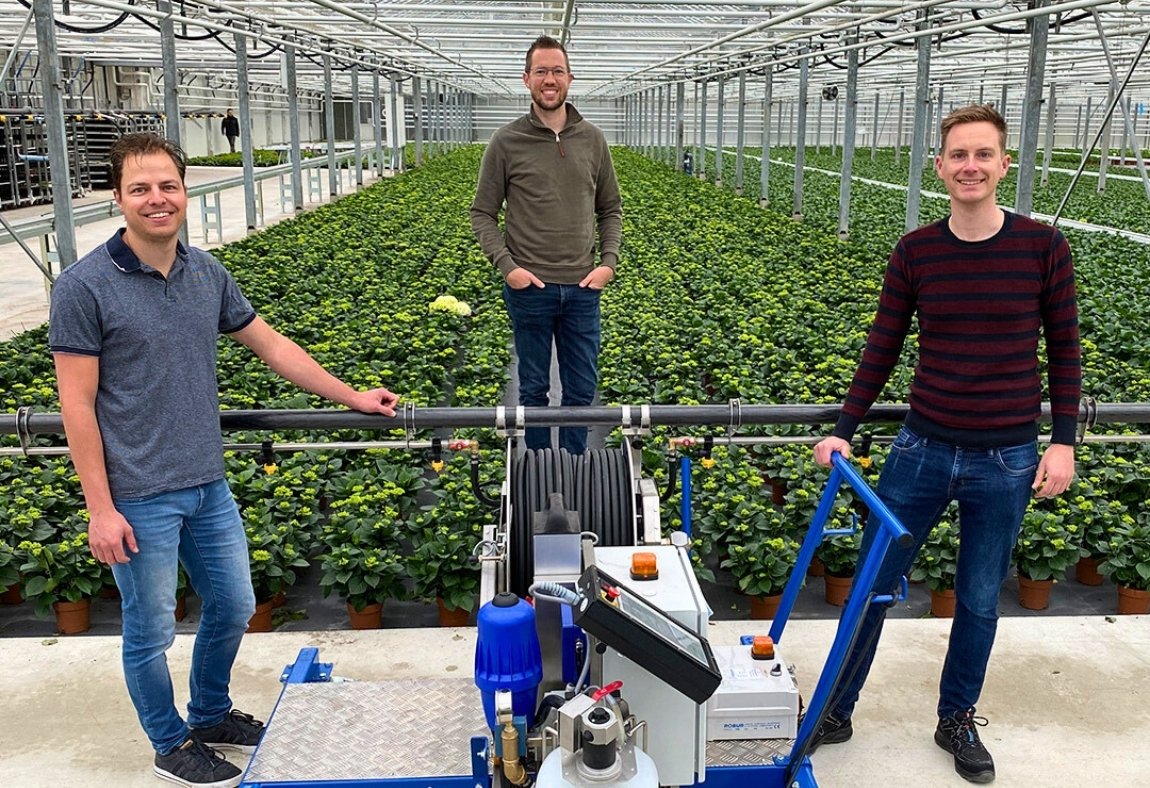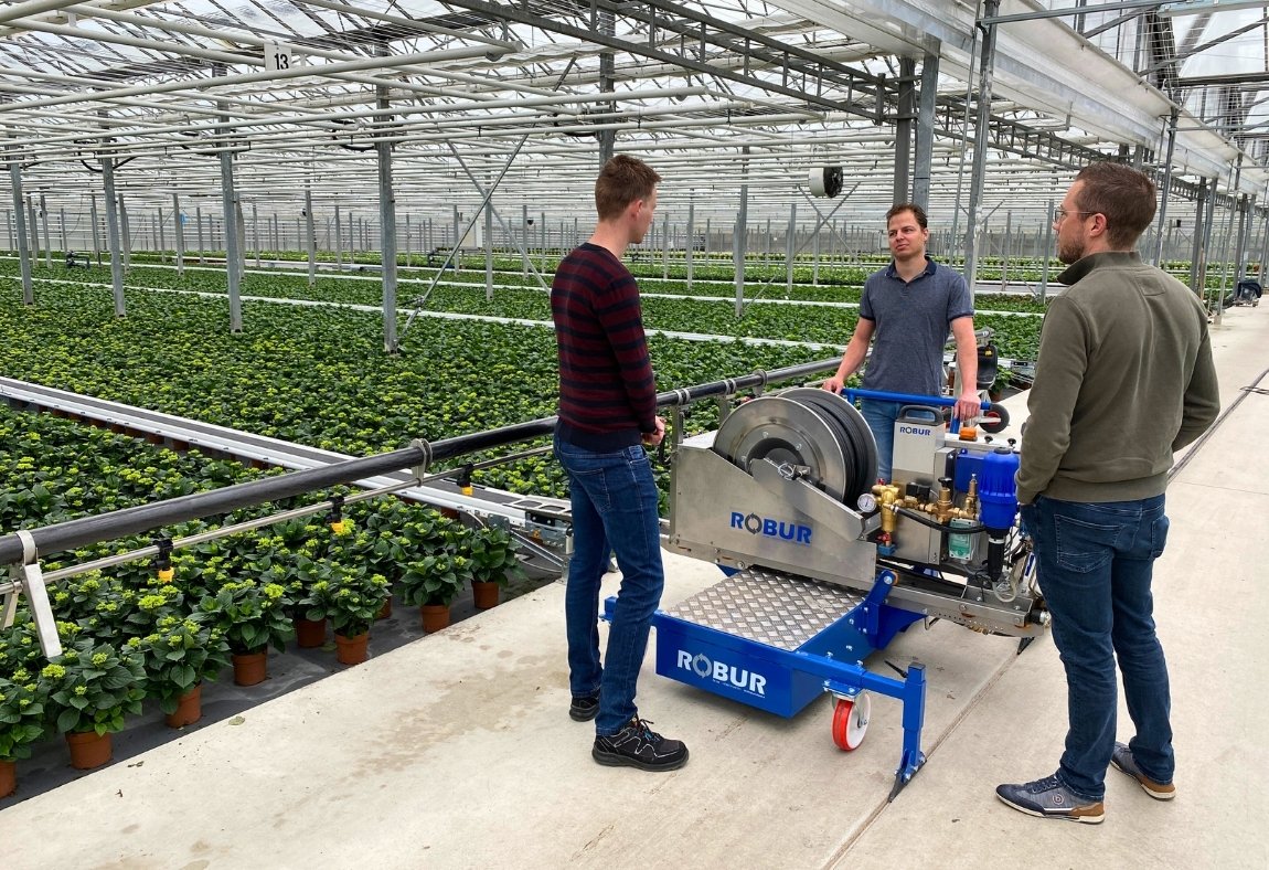 “Het idee kwam redelijk snel tot stand” vervolgt Jan, “al kostte het nog wel tijd om tot een concept te komen die we daadwerkelijk konden inzetten. Vragen als ‘hoe snel kunnen we rijden en hoeveel liters per minuut moeten er verwerkt worden’ moesten eerst geverifieerd worden, voordat wij het compleet op de tekentafel uitgewerkt hadden. Met een mini-installatie in de fabriek van Robur in het najaar, rijdt deze robot vanaf januari 2022 bij Mastergrowers.
