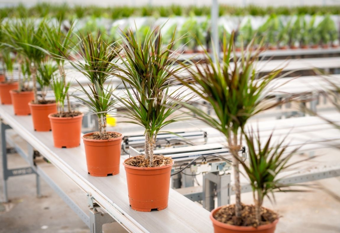 “De planten worden met een heftruck ingevoerd op een buffertafel. Daarbij brengen we yucca’s in eerste instantie naar een sorteerbuffer. Dit omdat daar een deel van in trays wordt afgeleverd en een ander deel terug de kas in gaat. De groene planten gaan via een andere buffertafel de afleverbuffer in. Hier checkt een camera de sortering van de plant en wordt op basis daarvan de bestemming in de afleverbuffer automatisch bepaald. Het WPS-systeem heeft zelfs de intelligentie, dat het zelf regelt dat de grootste planten niet naast andere grote planten in de buffer komen. Dit om schade bij inhaken te voorkomen. Zowel de medewerkers als de planten worden hier zichtbaar gelukkiger van.”